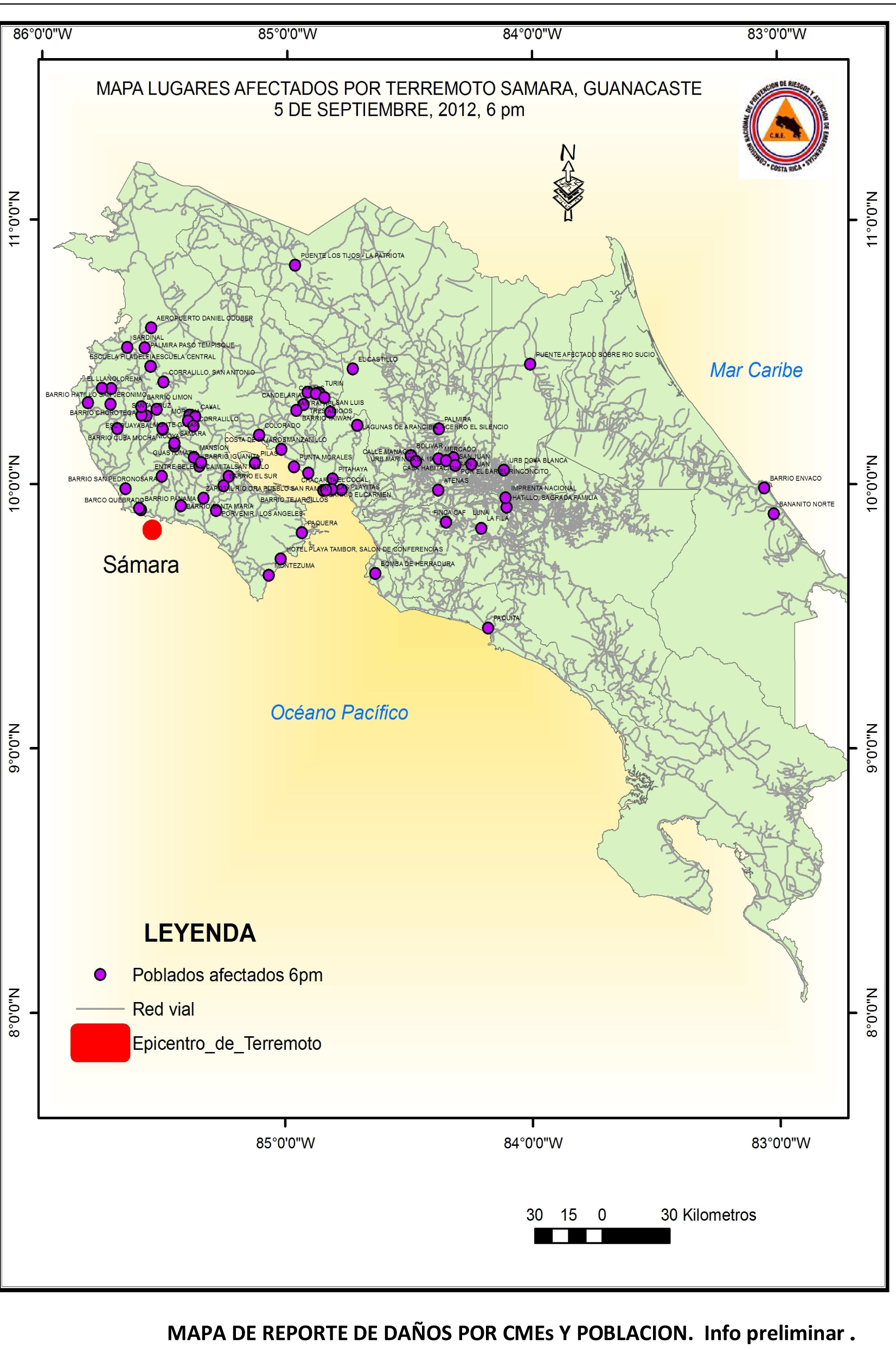 The coast of Costa Rica was struck on 5 September 2012 at 08:42 a.m. local time by a major earthquake with the epicenter located in the Nicoya Península. The United States Geological Survey (USGS) indicated a magnitude of 7.6. on the Richter scale. The epicenter is located very close to the surface, approximately in a depth of 10 kilometres. A tsunami warning was in effect for Costa Rica, Panama and Nicaragua, issued by the Pacific Tsunami Warning Centre but it was cancelled two and a half hours later based on data gathered from tide gauges. A map displaying the epicenter was provided by Geographer Douglas Salgado from the National Risk Prevention and Emergency Response Commission of Costa Rica (CNE).