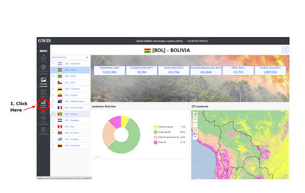 3. After selecting the desired country, the landing page of the desired country appears presenting general data on the country. Click on the "Country charts" menu on the left margin to proceed (see figure 3). It may be that initially, this option appears with a dark grey color font. Nevertheless, it is selectable when clicked and will turn to white color font.