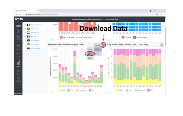 5.  Once the new window pops up, slide the circle in the top left slide bar to span the period from the year 2005 to 2019. Then scroll down to the graph entitled ‘Yearly Burned Area by Landcover – [2002-2019]’. Hover over the download icon, and download the data as CSV (see figure 5).