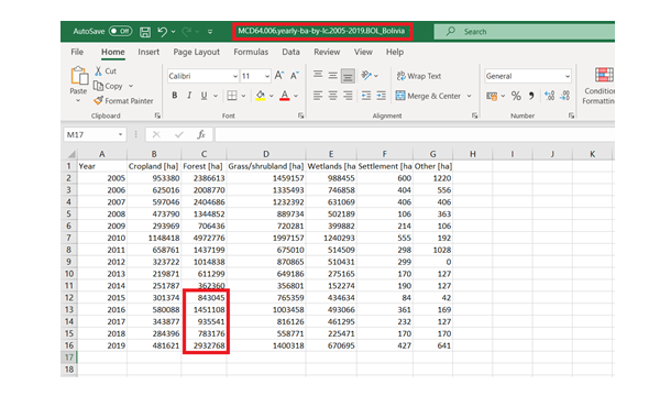 6. Open the excel file that was downloaded. The file name will start with ‘MCD64.006’, referring to the MODIS Collection 6 burned area product MCD64 A1 from which burnt area statistics are computed.  MODIS (or Moderate Resolution Imaging Spectroradiometer) is a key instrument aboard the Terra and Aqua satellites. These two satellites are viewing the entire Earth's surface every 1 to 2 days, acquiring data in 36 spectral bands, or groups of wavelengths. The data presented in GWIS employs a combination of daily 500m MODIS surface reflectance and 1km MODIS active fire observations, and applies dynamic thresholds to composite Terra and Aqua imagery generated from a burn-sensitive vegetation index from MODIS 1240 and 2130 nanometer bands and a measure of temporal variability (GWIS, 2021). The algorithms’ coupled use of active-fire and reflectance data enables it to adapt regionally and over varied ecosystems, and performs substantially better in reducing the number of unclassified grid cells due to  cloud contaminated observations compared to the heritage Collection 5.1 MODIS products (Giglio et al, 2018).