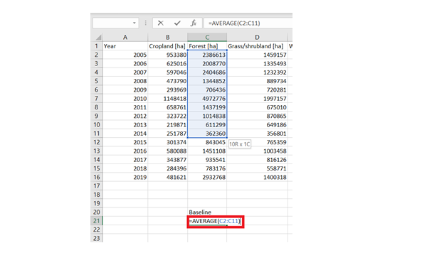 7. Member states are encouraged to include baseline data for Target C for improved analysis of progress over time. To calculate the mean annual burned area for the period for 2005-2014 in Excel, use the AVERAGE function and select cells corresponding to yearly burned area between the years 2005 and 2014 (see figure 9).