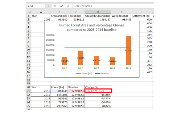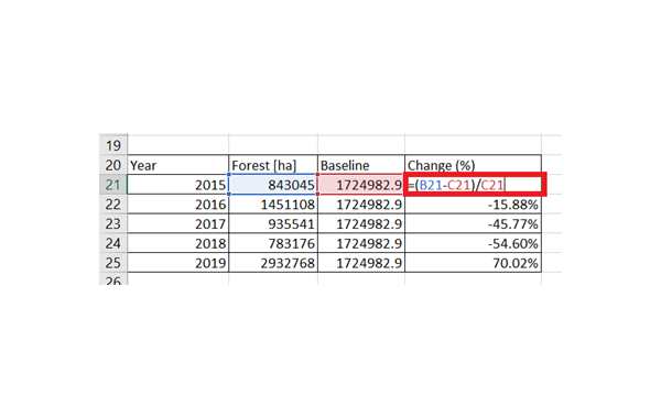 8. To calculate percentage change in any year relative to the baseline, first create a table similar to the one that can be seen in figure 9, containing the data related to the years 2015-2019 and the value for burned forest area and the baseline that was calculated earlier. Subtract the baseline value from the number of hectares burned for any year, and divide by the baseline. Ensure the cell format is converted to ‘Percentage’ (see figure 10).
