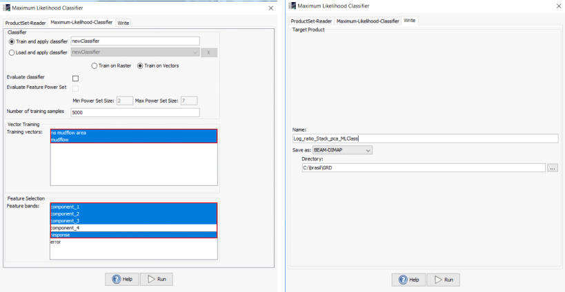 Select the two “training vector” classes previously defined and the “feature bands” (out band components and response band) as shown in the Figure 29.