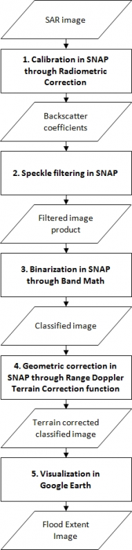 This practice can be applied globally. It has been applied successfully for floods in Australia, Africa and Asia. The precondition for SAR water detection is a smooth water surface. False alarm can occur in areas of radar shadow due to variable terrain. False alarm can also occur with smooth objects like roads and sand. Flood detection in urban areas remains difficult. The detection of flooded vegetation from SAR imagery requires a different approach using two multi-temporal images.