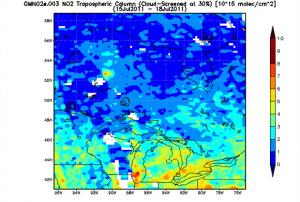 An image of the pollution from fires in Ontario was created from data of nitrogen dioxide (NO2) levels over the period from July 15, 2011 to July 18, 2011. It was created from Ozone Measuring Instrument (OMI) data using the NASA Giovanni system by Dr. James Acker at NASA's Goddard Space Flight Center in Greenbelt, Md.