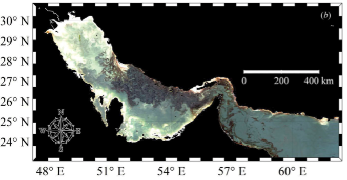 Figura 5. Imagen de MODIS/Rojo-Verde-Azul Mejorado derivado de Aqua (ERGB) recopilado el 23 de diciembre de 2008 sobre el Golfo de Omán. El color cfé oscuro en la imagen ERGB indica la aparición de la floración de algas. (Zhao et al 2016)