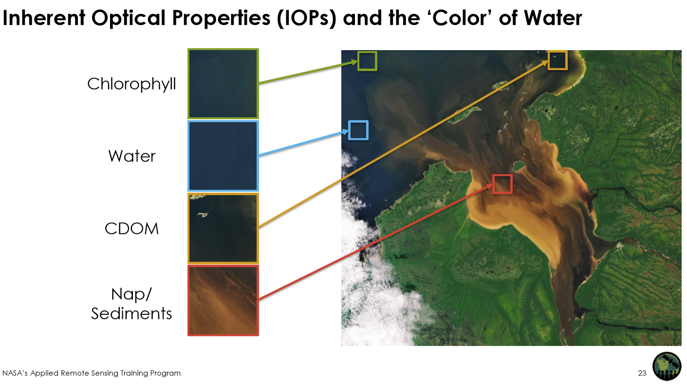 Figura 4. Propiedades ópticas inherentes y el color del agua. Imagen: Programa de Entrenamiento de Teledetección Aplicada de la NASA