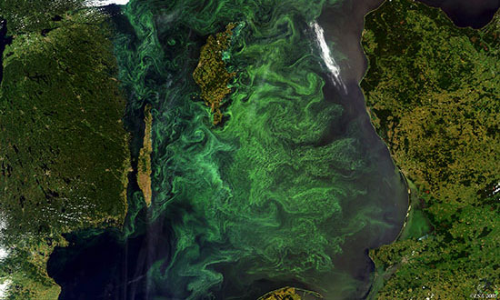 | Floración de algas rojas en Leigh, cerca de Cape Rodney, Nueva Zelanda. Imagen: Miriam Godfrey para el Instituto Nacional de Investigación del Agua y la Atmósfera de Nueva Zelanda. | Imagen de MERIS del 13 de julio del 2005 sobre el mar Báltico, que muestra una gran floración de algas de cianobacterias. Imagen: ESA