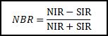 Las áreas quemadas y la severidad del fuego (severidad de la quemadura) también pueden evaluarse mediante la Relación de Quema Normalizada (Normalized Burn Ratio, NBR por sus siglas en inglés). La fórmula NBR es similar a la NDVI (consulte la aplicación del índice de vegetación). La única diferencia es que el NBR utiliza las bandas de infrarrojo cercano (NIR) e infrarrojo de onda corta (SWIR). La fórmula tiene el siguiente aspecto y se puede utilizar en la calculadora de imágenes o en cualquier software de calculadora de satélites: