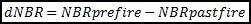 La NBR se calcula normalmente para una imagen de satélite antes y después de un incendio forestal. La extensión del área quemada y la gravedad se pueden encontrar al calcular la diferencia entre los valores NBR antes y después del incendio forestal.