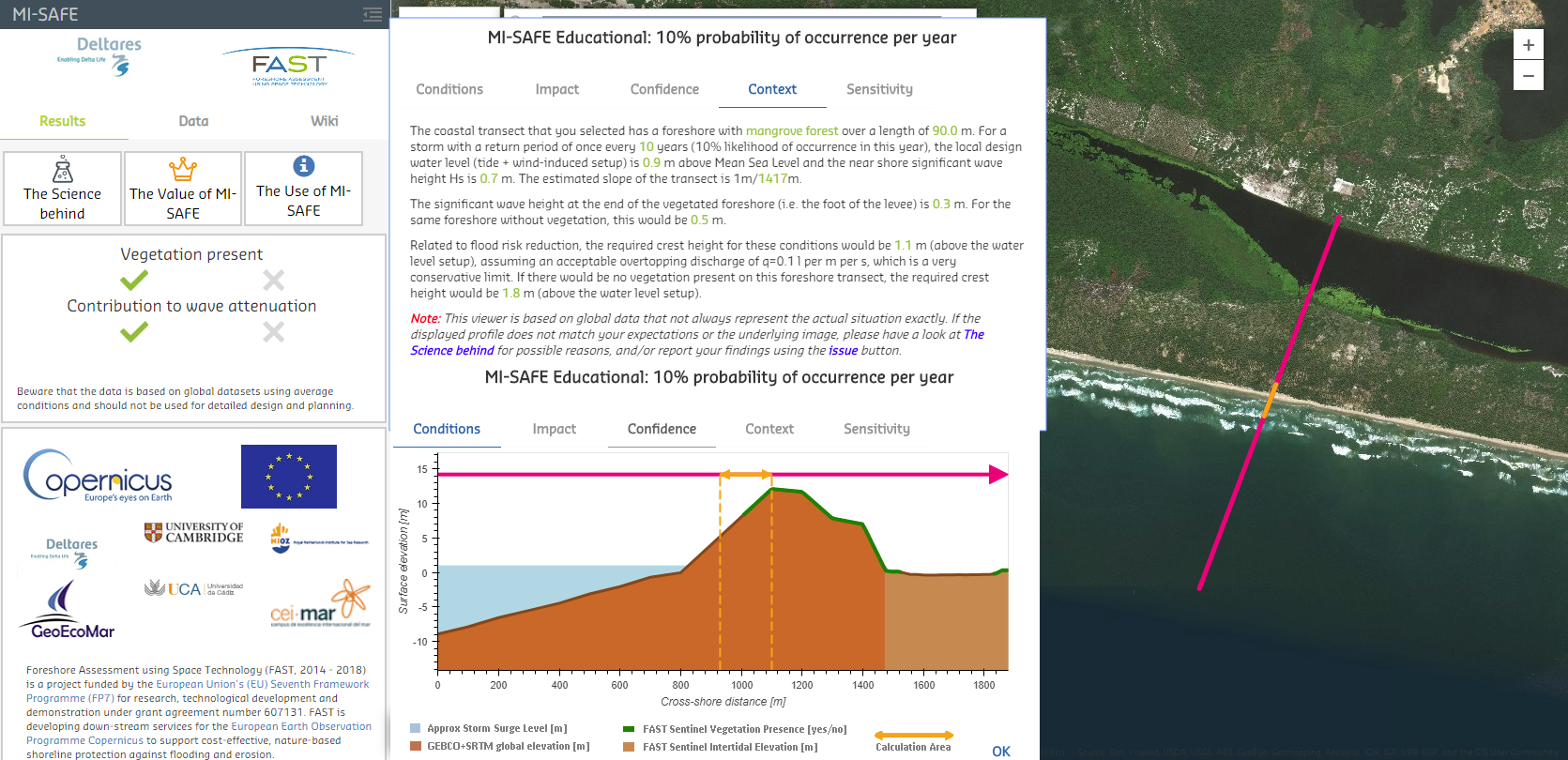 El software MI-SAFE y el visor web se desarrollaron en el marco del proyecto FP7 FAST (Evaluación de la costa utilizando tecnología espacial) financiado por la Unión Europea. El visor MI-SAFE está destinado a ilustrar cómo la vegetación costera puede atenuar la altura de las olas en lugares costeros, en cualquier parte del mundo. Los tipos de vegetación se basan en los datos de Cobertura de la Tierra Corine 2009, para las zonas no templadas a nivel mundial, se aplica un mapa de distribución global de manglares de 2011 para indicar si la vegetación encontrada son manglares.