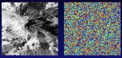 La amplitud (imagen izquierda) y la fase (imagen derecha) de la señal retrodispersada sobre el Etna. El patrón topográfico se identifica en la imagen de amplitud, mientras que la imagen de fase parece aleatoria. Imagen: http://epsilon.nought.de/tutorials/insar_tmr/img35.htm.