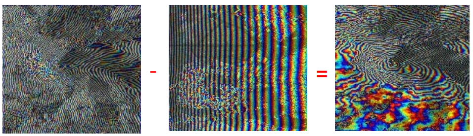 El primer interferograma (imagen izquierda) contiene la contribución de la fase terrestre plana (imagen central) y, después de su sustracción, obtenemos el interferograma aplanado (imagen derecha). Imágenes: http://epsilon.nought.de/tutorials/insar_tmr/img35.htm.