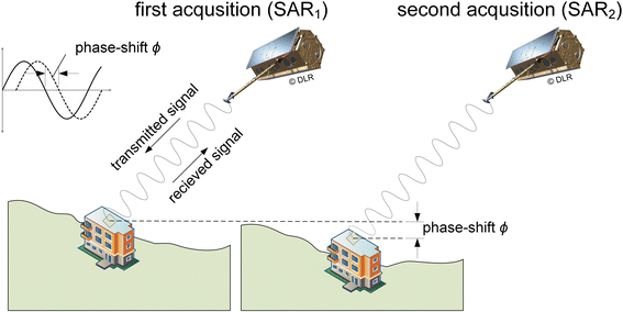 El desplazamiento se deriva del cambio de fase de dos adquisiciones de SAR. Imagen: Schindler et al., 2016