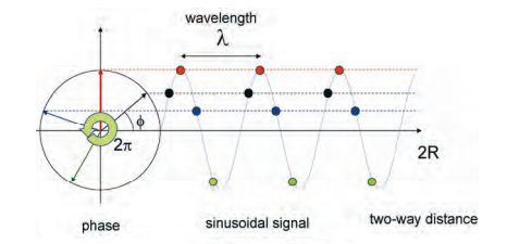La fase de cada pixel representa la diferencia de fase entre la señal emitida y la recibida. Como se conoce la fase de la onda saliente, puede compararse con la fase de la onda devuelta. La fase de la señal recibida está relacionada con la distancia del sensor y el objetivo, ya que la longitud de la ruta hacia el objetivo y la espalda se compone de longitudes de onda completas más una fracción de la longitud de onda. Esta fracción extra de longitud de onda se mide con gran precisión. La fase es la suma de las contribuciones de varios efectos, la trayectoria de desplazamiento bidireccional (sensor-objetivo-sensor), la interacción entre las ondas electromagnéticas, incidentes y los dispersores dentro de la celda de resolución del suelo, y el cambio de fase inducido por el sistema de procesamiento utilizado para enfocar la imagen. Por lo tanto, la fase de cambio de un pixel a otro dentro de una sola imagen SAR parece aleatoria y no tiene ningún uso práctico. Sin embargo, la diferencia de fase de dos imágenes SAR desde ángulos de visión ligeramente diferentes se puede aprovechar para generar la topografía y monitorear los cambios de terreno.