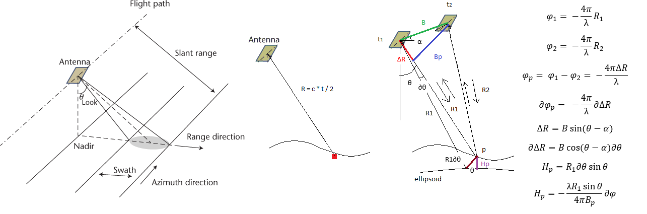 Sobre la base de la configuración interferométrica (imagen) y las relaciones geométricas entre las observaciones de dos fases se pueden derivar las estimaciones de la altura topográfica y la deformación de la superficie. En otras palabras, la fase interferométrica de cada pixel que supone que hay un dispersador dominante que no cambia con el tiempo depende solo de la diferencia en las rutas de viaje de cada uno de los dos SAR (δϕ = 4π ΔRλ)