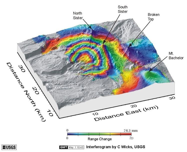 Deformación de la tierra centrada a 5 km al oeste del volcán Sister Sur en el centro de Oregon. Cada ciclo de color de azul a rojo representa un movimiento de 2,8 cm del suelo hacia el satélite. Imagen: USGS.
