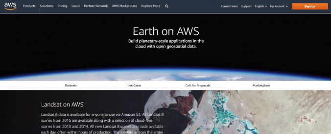 | Space-based Information: | AWS offers free and commercial satellite data. Special data sets for even commercial images are freely available, and access is also granted without charges for certain research purposes. Sentinel -2, Landsat 8, Modis (Terra)/(Aqua), Worldview, SRTM (30m) digital elevation data, GDELT monitor of world's broadcast, print and web news, NASA Earth Exchange climate data, GOES, MOGREPS, OpenAirQuality |