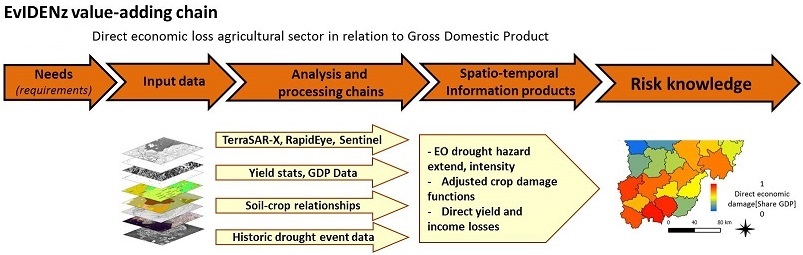 El proyecto se centra en el Marco de Sendai para la Reducción del Riesgo de Desastres 2015-2030 (SFDRR) para la reducción del riesgo de sequía, y pretende destacar las sinergias con las demandas de la CMNUCC y la Agenda 2030. Los resultados del proyecto EvIDENz permitirán la asimilación a nivel nacional proporcionando, por ejemplo, el conocimiento del riesgo (prioridad para la Acción 1 en SFDRR) a través de la vigilancia del riesgo de sequía agrícola basada en la observación de la Tierra, la exposición y la vulnerabilidad del sector agrícola, las pérdidas de rendimiento específicas para cada evento y el apoyo al Objetivo B de SFDRR sobre las personas afectadas por las sequías y el Objetivo C sobre las pérdidas económicas directas por las sequías en el sector agrícola.