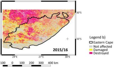 El monitoreo del impacto de la sequía agrícola en este proyecto piloto se realiza con sensores espaciales en combinación con datos agrícolas y censales de la Provincia Oriental del Cabo. La Práctica Recomendada EvIDENz proporciona una estimación del número de personas afectadas en el sector agrícola (ganado y cultivos) debido al riesgo de sequía agrícola.