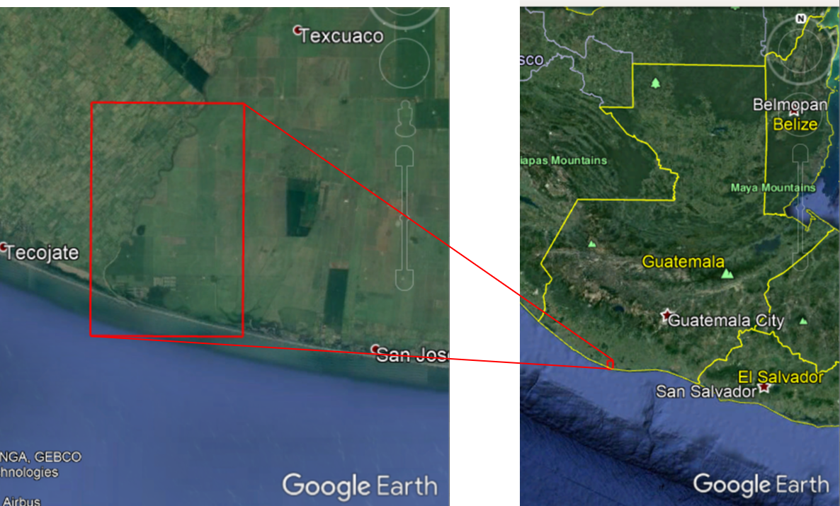 The Coyolate river is one of several rivers that originates in the highlands of Guatemala and in the foothills of the Fuego and Acatenango volcanoes. Its lower basin, in the Pacific coastal plains, experiences floods triggered by intense precipitation and is affected by massive sedimentation as a result of the transport of volcanic material from the cone of the active Fuego volcano during the rainy season.