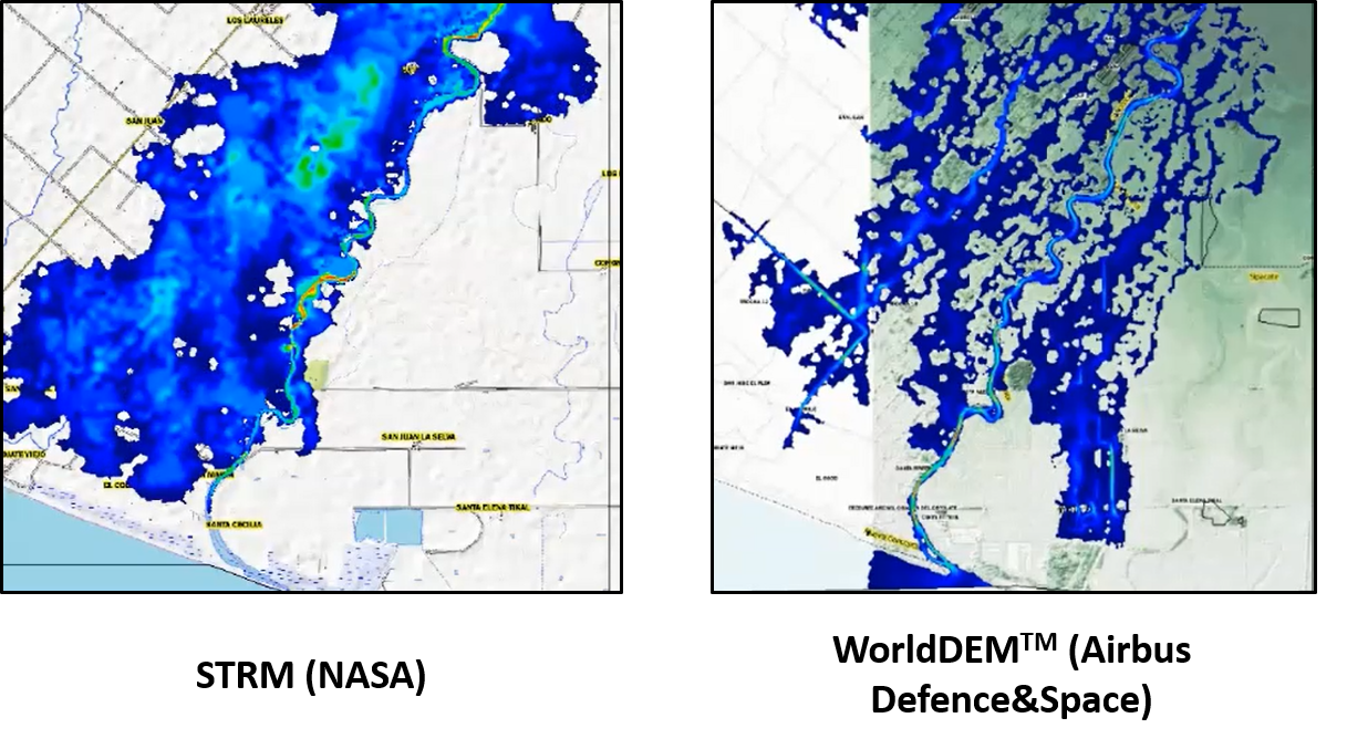 • Resolution: The level of detail of WorldDEMTM has a relative accuracy of less than 2 meters for slopes less than 20%; and  less than 4 meters for slope above 20%. This is very beneficial in regions of moderate and plain terrain where accuracy of flood modelling results strongly correlates with the accuracy of the DEM used as input.
