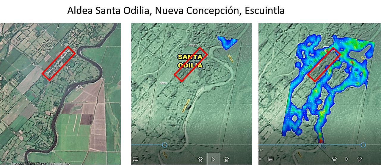 Figure 3: Santa Odilia village in the Coyolate floodplains and modelling of floods in the vicinity. As can be seen, in case of floods the village may not be inundated, but access to the village by road will not be possible.