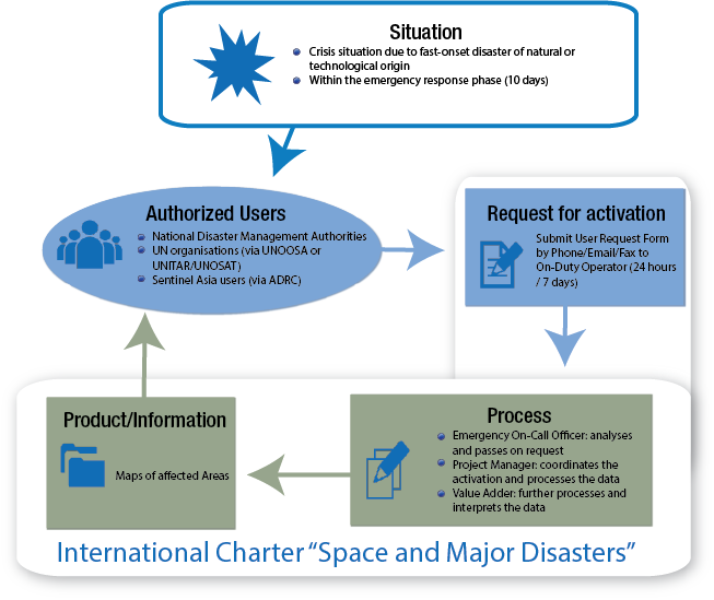 The Charter can be activated at the request of Authorized Users (AUs). Until recently, AUs were typically disaster management authorities belonging to the countries whose space agencies were members of the Charter. AUs are now able to request the activation of the Charter to support emergencies in their own country, as well as in a country with which they cooperate. UNOOSA and UNITAR/UNOSAT can also request the activation of the mechanism on behalf of UN organizations in countries experiencing large-scale disasters.