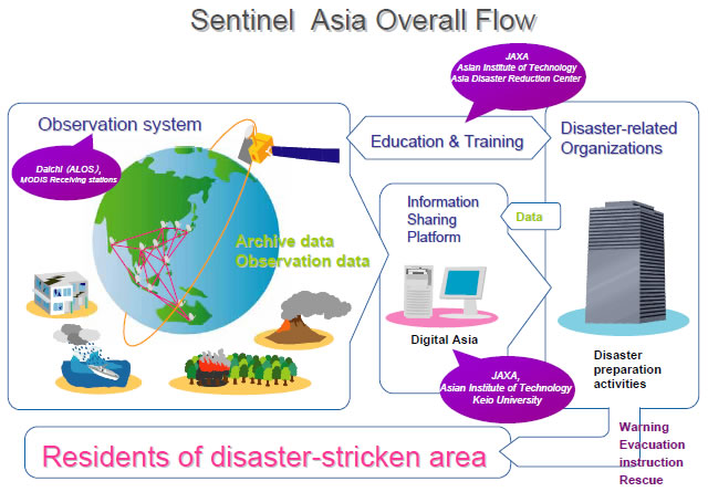 JAXA is pursuing great possibilities in various aerospace fields and is striving to succeed with various research and development missions in order to contribute to the peace and happiness of humankind. It is active in several areas, including the Earth observation programme (active missions ALOS, GOSAT). One of the JAXA's satellites is specialized on providing data for Sentinel Asia. This information flow is visualized on the following picture: