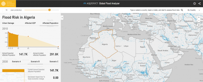| Space-based Information: | The Global Flood Analyzer by the World Resources Institute is a tool to analyze flood risks. Parameter estimates for urban damage, affected GDP, affected population, annual expected urban damage and annual avoided urban damage for various three scenarios are visualized. Increased impact due to socio-economic change, climate change and future expected damages (2030) are compared against the base case of current annual expected damage. The scenarios are based upon the 5th Assessment report by the Intergovernmental Panel on Climate Change. For the current scenario, hydrological data from 1960 through 1999 for generating flood inundations for 9 return periods were used, from 2-year flood to 1000-year flood, and 2010 GDP, population, and land use data for assessing flood impacts. For future projections, 5 GCMs (Global Climate Models) from CMIP5 (Coupled Model Intercomparison Project Phase 5) projecting future flood inundations under two climate scenarios we used, RCP4.5 (Representative Concentration Pathway) and RCP8.5, and projected socio-economic changes using SSP2 (Shared Socio-economic Pathway) and SSP3, from the Intergovernmental Panel on Climate Change Assessment Report 5. |