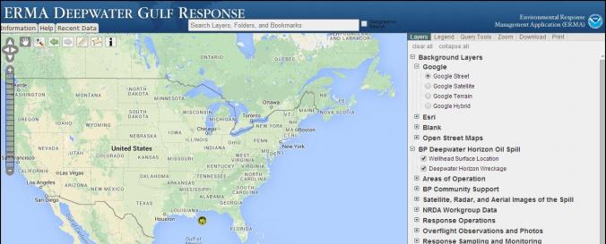 | Space-based Information: | ERMA® is an online mapping tool that integrates both static and real-time data, such as Environmental Sensitivity Index (ESI) maps, ship locations, weather, and ocean currents, in a centralized, easy-to-use format for environmental responders and decision makers |