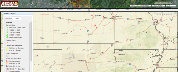 | Space-based Information: | The GEOMAC Wildland Fire Support includes layers on: point-layer of past years fires, fire boundaries/ perimeter, current firest, satellite-based fire detection: MODIS VIIRS HMS, wildland-urban interface, |