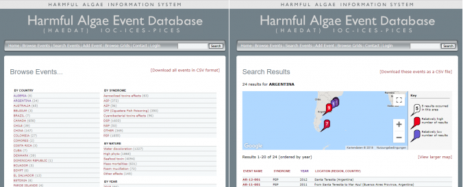 | Restrictions/ Citation of the dataset: | HAEDAT Disclaimer: The HAEDAT database contains information based on yearly national reports by ICES and PICES member states. The available information on individual events varies greatly from event to event or country to country. Monitoring intensity, number of monitoring stations, number of samplings, stations, etc. also varies greatly and therefore there is not a direct proportionality between recorded events and actual occurrences of e.g. toxicity in a given region. Furthermore, areas with numerous recorded occurrences of HAE's, but with an efficient monitoring and management programmes, may have very few problems and a low risk of intoxications, whereas rare HAE's in other areas may cause severe problems and represent significant health risks. |