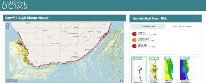 | Space-based Information: | Webmap of Algal bloom detections, CHl-A from MODIS nFLH, Sea Surface Temperature (Odyssea), Chlorophyll-A from Sentinel OLCI. The HAB Decision Support Tool (DeST) provides a capability for monitoring and assessing risk of HAB events for the South African coastal area to approximately 50km offshore. Risk assessment and monitoring is based on quantified understanding of bloom dynamics (Pitcher & Nelson, 2006), hypoxic impacts (Pitcher et al 2014), and earth observation monitoring capabilities (Bernard et al 2006). Maps of various ocean colour-derived phytoplankton biomass proxies, sea surface temperature, and ocean state (wind, current, sea state) are used to provide information on the presence and movement of blooms, and extracted time series of these data provide a "virtual buoy" capability giving a multi-parameter risk index. |