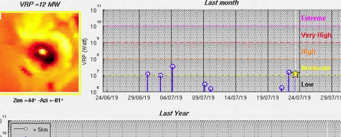 | Space-based Information: | Based on MODIS data, MIROVA detects near real time volcanic hot spots. In order to do so MIROVA analyses the MiddleInfraRed Radiation (MIR) measured over large volcanoes to detect, locate and measure the heat radiation from volcanic activity. This automated thermal monitoring of the most active volcanoes on Earth in near real time provides the user with a quick overview of the latest thermal images which are available for Google Earth overlapping. Additionally, MIROVA provides an updated Volcanic Radiative Power (VRP) time-series in logarithmic and normal scale. MIROVA has been developed as a collaboration between the University of Turin and the University of Florence. |