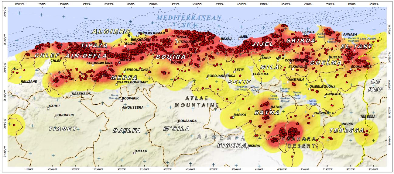 The maps produced by UNITAR/UNOSAT represent density of fire events in North Algeria between 1 June and 23 August 2012 and fire scars as of 18 August 2012. They are accompanied by graphs representing a complete history of MODIS fire detections from an aggregate of the Charter area of interest, summarized by daily total fire detections during 1 January 2000 - 23 August 2012.