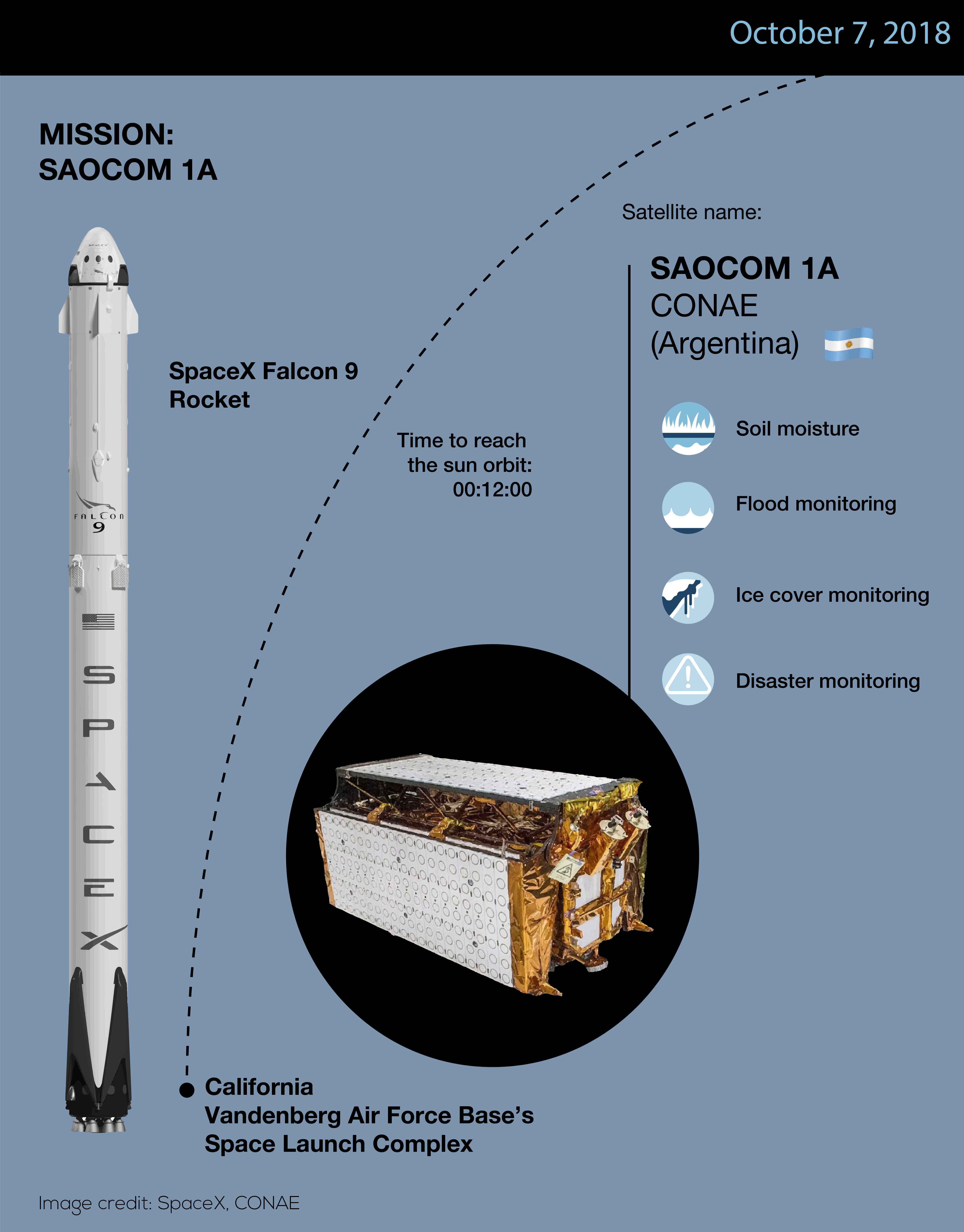 The Argentina National Space Activities Commission (CONAE) launched a new Earth observation satellite that will support disaster management efforts. SAOCOM 1A is the first of a constellation of two radar satellites. The remote sensing mission aims to provide timely information for disaster management as well as monitoring services for agriculture, mining and ocean applications.