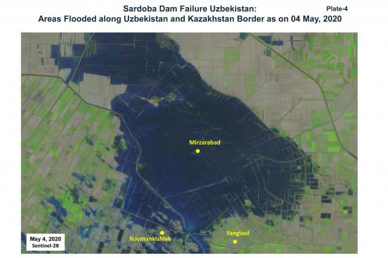 Using space-based information, the Centre for Space Science and Technology Education in Asia and the Pacific (CSSTEAP) affiliated to the United Nations has analysed the recent failure of a dam around the Sardoba Reservoir in Uzbekistan. Following a week of heavy rain in the region, the wall of the dam broke on 1 May and flooded surroundings in Uzbekistan as well as Kazakhstan to the north. According to media reports, the breach led to the evacuation of thousands of people in the area.