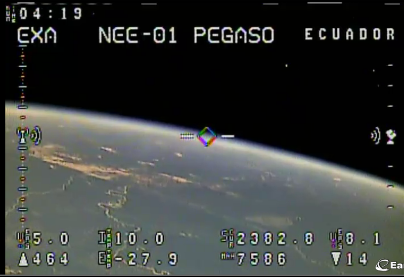 Pegaso is a nanosatellite weighing 1.2 kilograms, 75 cm long and 10 cm high. Pegasus orbits at an altitude of 650 kilometers above the Earth, with an inclination of 98.05 degrees and a beta angle of 22.05 degrees. It was launched on April 25 from the Jiuquan spaceport in China. It was built by the Ecuadorian Civilian Space Agency, and finished in April 2011.