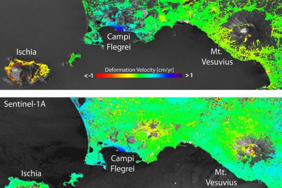 The mean deformation velocity maps generated from Sentinel-1A data over Italy’s Bay of Naples are a good example of the increased spatial coverage from surface deformation maps. In this area where are located three main volcanic complexes, Mount Vesuvius, the Phlegraean Fields and Ischia island, the Sentinel-1A maps clearly show the volcano’s ‘spreading effect’ at the summit of Mount Vesuvius, which was only partially visible with previous products from ERS and Envisat.