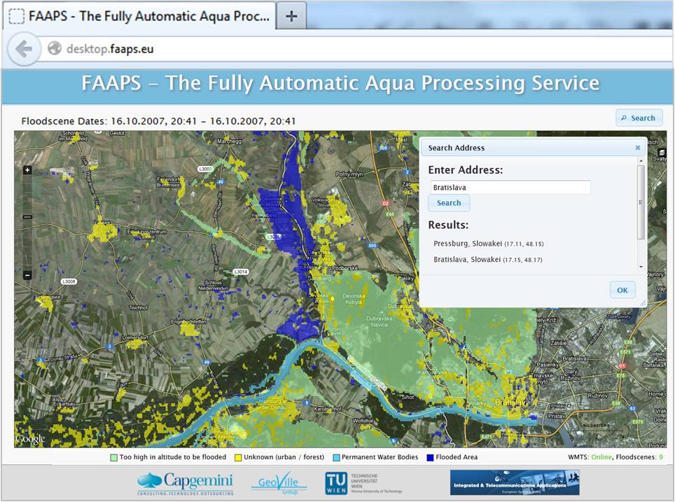 ESA has collaborated with Capgemini, GeoVille Information Systems, Vienna University of Technology and Luxembourg’s Gabriel Lippmann research centre to develop a simple, easy-to-use system that could be available to anyone online, as the agency reported on their website. Near-realtime satellite radar measurements are processed to create location-specific flood maps and deliver them via the Internet. This Fully Automated Aqua Processing Service, or FAAPS, was developed and demonstrated through ESA’s Integrated Application Promotion.