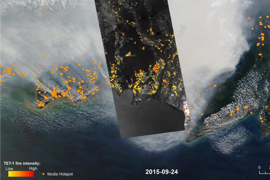 Meanwhile, a German research cooperation effort conducted by the GeoBio Center of the Ludwig-Maximilians-University (LMU) in Munich, the German Aerospace Center (DLR) and the remote sensing services company RSS GmbH of Germany detected additional fire hot spots under the Indonesian haze making use of satellite imagery from the microsatellite TET-1. Due to the higher sensitivity of the sensor in the microsatellite and improved camera resolution, the satellite detects and measures even smaller fire hot spots under the haze. The time series of satellite imagery can therefore contribute to identify the causes of the forest fires, their patterns of dissemination and the speed of fire fronts. Furthermore, the researchers are able to assess additional parameters such as fire temperature and heat production through satellite imagery, providing important information for those in charge of combating the fires.