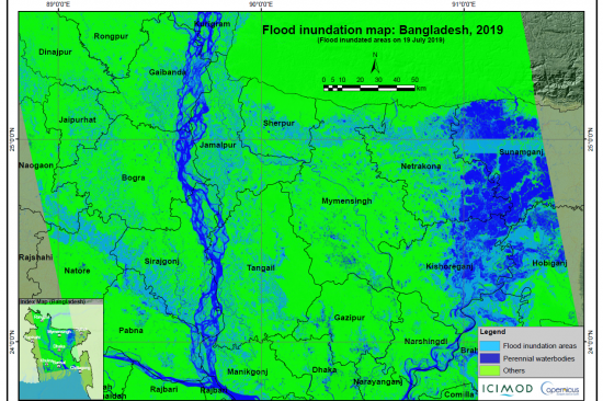 In July 2019, Bangladesh, India and Nepal experienced floods and landslides during the South Asian monsoon season. On the night of the 17 July, the Jamuna river in Bangladesh broke through the embankment, inundating over 40 villages and displacing more than 200,000 people. Experts of the International Centre for Integrated Mountain Development (ICIMOD), a UN-SPIDER Regional Support Office, prepared flood inundation maps after the floods struck Bangladesh. By making use of free satellite data from the Sentinel-1 satellite of the Copernicus programme, ICIMOD experts were able to create maps that give a synoptic overview of the extent of inundation caused by the floods.