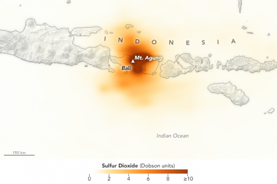 Space-based information still plays an important part in managing such disasters. Satellite measurements help assess gases venting out of volcanoes and show how much the ground over a volcano bulges as magma inside the Earth tries to find an outlet. Seeing whether carbon dioxide is being released from the magma before it releases the surface can potentially give an advanced warning of an eruption. However, measuring how much magma is inside the volcano and whether it is going to increase or gradually wane remains a difficult task to accomplish. Data from the NASA Aura satellite shows high sulfur dioxide (SO2) concentrations from Mount Agung and the NASA Modis satellite has detected a thermal anomaly in the crater of the volcano after constantly scanning the earth’s surface for cloud formations, changes in the carbon cycle, and sources of heat . The ongoing volcanic activity in Indonesia can be seen on this live map.