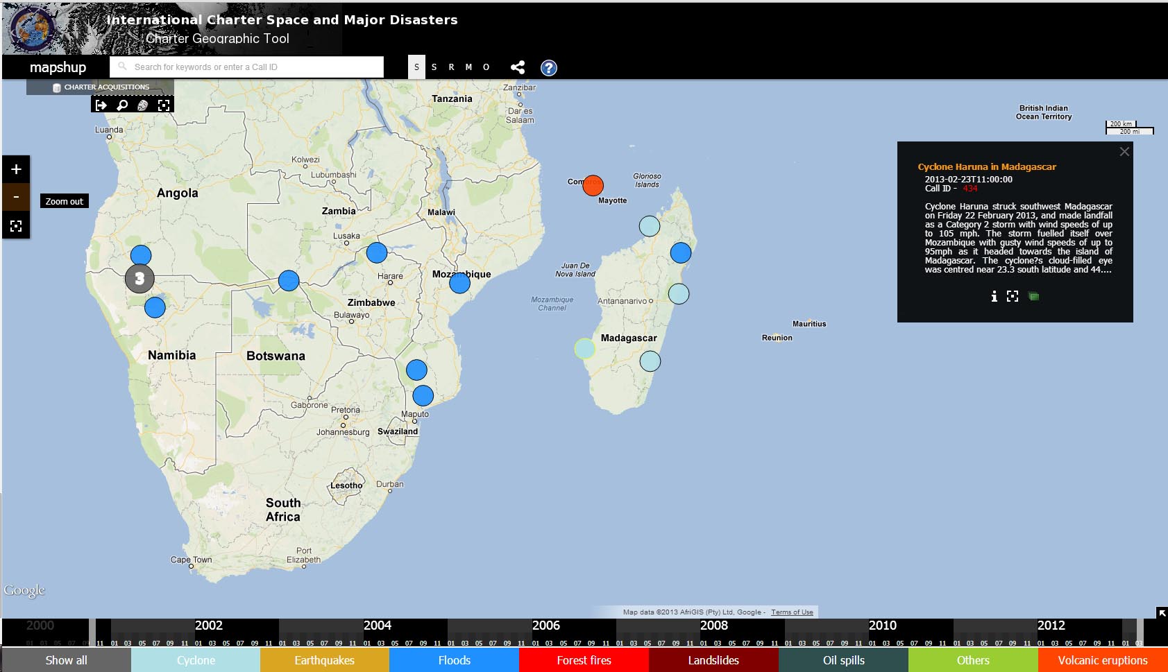 The “Charter Geographic Tool” was developed by the Charter member CNES (French National Centre for Space Studies) in order to establish a comprehensive record of all images acquired by the Charter members in response to Charter activations, as the international mechanism reports in its latest newsletter. Over and above the utility of such a record as an internal tool to the Charter, the main user requirement driving the development came from actors across the disaster management cycle to know where image data had been acquired during a given activation.