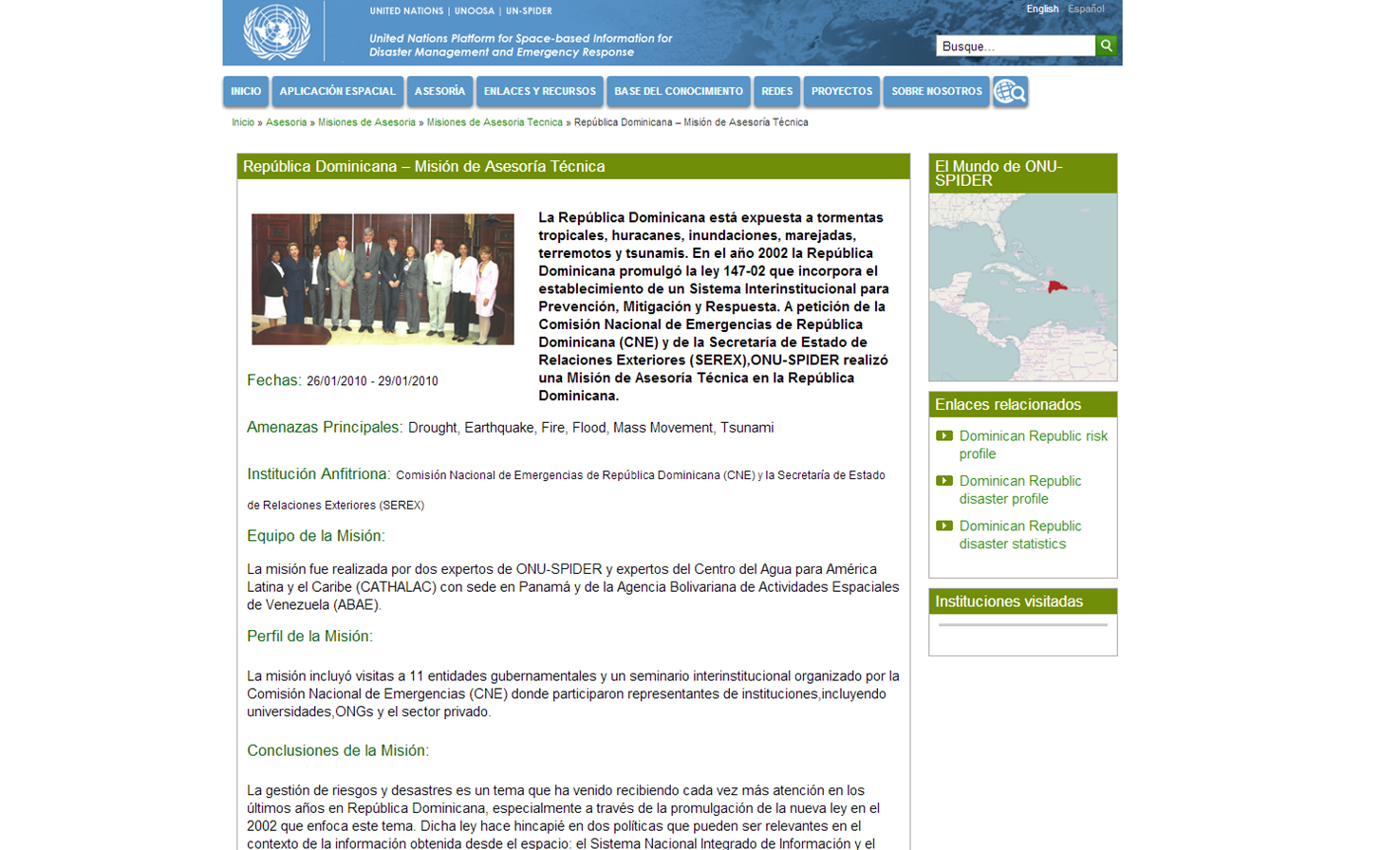 By making available relevant content of the Portal, such as selected Regional Support Offices, mission profiles and emergency mechanisms in the Spanish language, the UN-SPIDER team aims to allow more users from Latin America and the Caribbean, where UN-SPIDER has already conducted numerous activities, to benefit from the resources made available on the website. Users can easily switch between the Spanish and the English version by clicking the corresponding language buttons at the upper right corner of the page.
