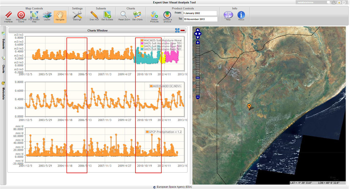 The Multi-sensor Evolution Analysis (MEA) platform supports Earth Observation communities in loading, visualizing and analysing multi-dimensional datasets. Implemented in the framework of the European Space Agency ASIM project, MEA has been recently adopted in the European Commission EarthServer initiative as graphic user interface of the Climate Data Service. MEA is a multi-product satellite data management and exploitation system that allows its users to access to a wide set of satellite-based data (e.g. vegetation indexes, soil moisture, precipitation) and display the temporal evolution of these fields to identify long term trends as well as short term / abrupt changes. The global coverage as well as the fast response to data access, and the possibility to visualize many fields simultaneously, make of MEA a powerful tool to monitor the effect of long term trends (e.g. drought) and early identify the effect that climate change is having on areas more prone to natural threats.