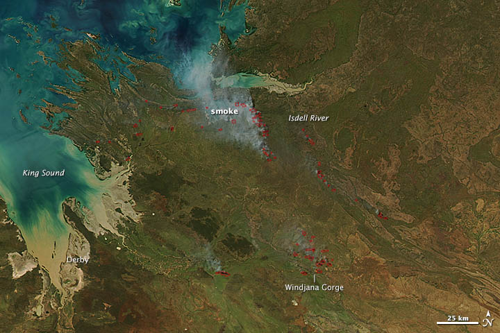 NASA's Aqua satellite with its Moderate Resolution Imaging Spectroradiometer (MODIS) has acquired an image in Kimberly region on 10 April 2013, Australia showing dozens of managed fires. All of the fires were south and west of the Isdell River; some were burning in and near Windjana Gorge National Park, a popular tourist destination. MODIS detected the fires by thermal infrared energy radiating from the land surface. The locations where MODIS detected fire are labeled with red outlines.