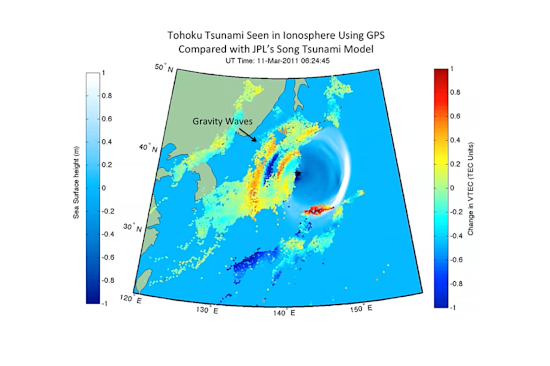 Main image: Picture showing how waves of energy from the Tohoku-Oki earthquake and tsunami of March 11, 2011, pierced Earth’s ionosphere in the vicinity of Japan, disturbing the density of electrons. These disturbances were monitored by tracking GPS signals between satellites and ground receivers. © NASA/JPL-Caltech