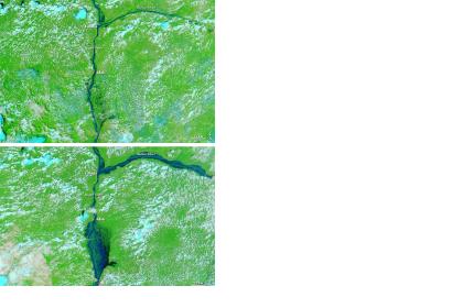 The Moderate Resolution Imaging Spectroradiometer (MODIS) on NASA's Aqua satellites captured an image of the confluence of the Niger and Benue Rivers in southern Nigeria on October 11, 2012. The comparison to an images acquired October 8, 2010 shows the extent of the floods. Both images use a combination of visible and infrared light to better distinguish between water and land. Water varies from electric blue to navy, vegetation is bright green, and clouds range in color from nearly white to pale blue-green.